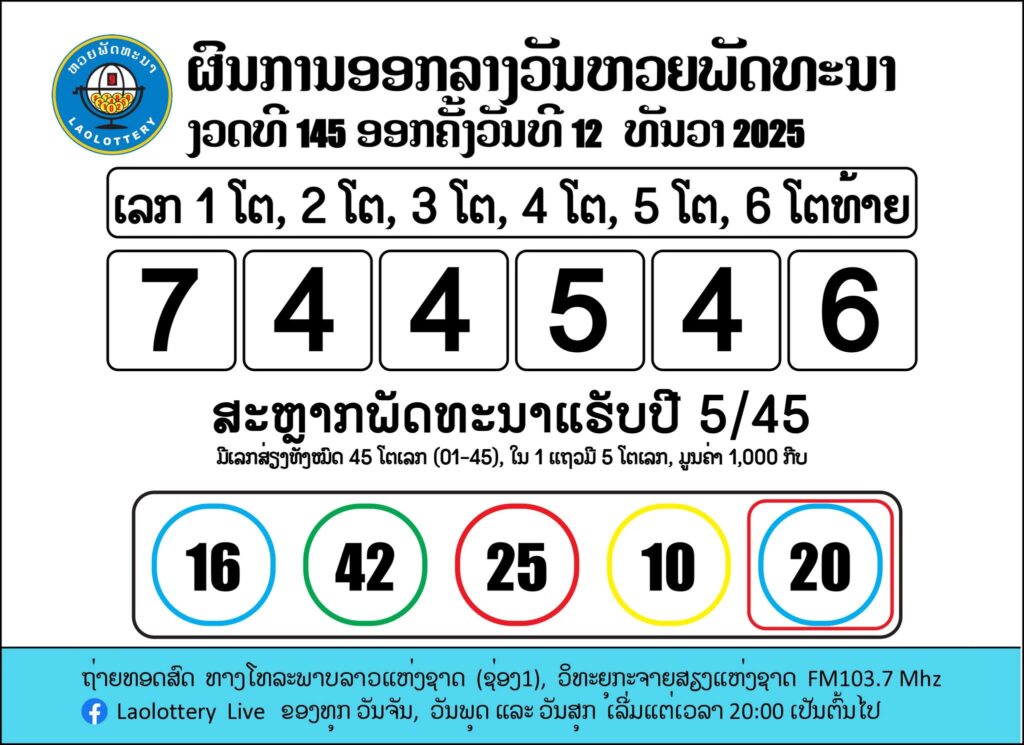ผลรางวัลหวยลาววันนี้ งวดวันที่ 12 ธันวาคม 2568