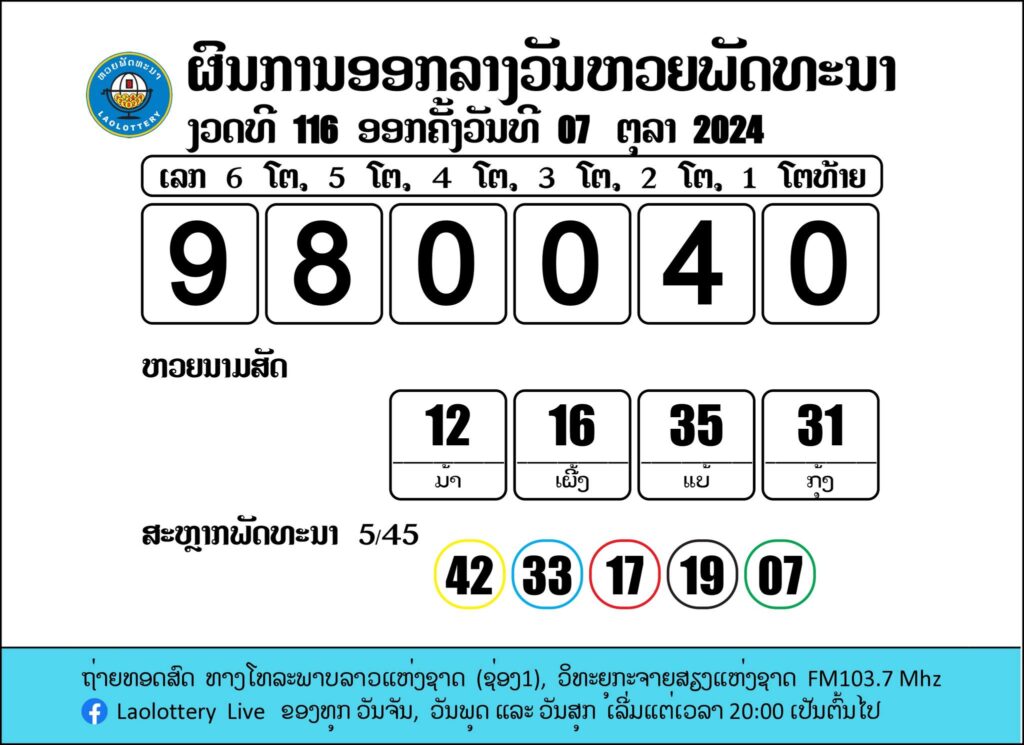 ผลรางวัลหวยลาววันนี้ งวดวันที่ 7 ตุลาคม 2567