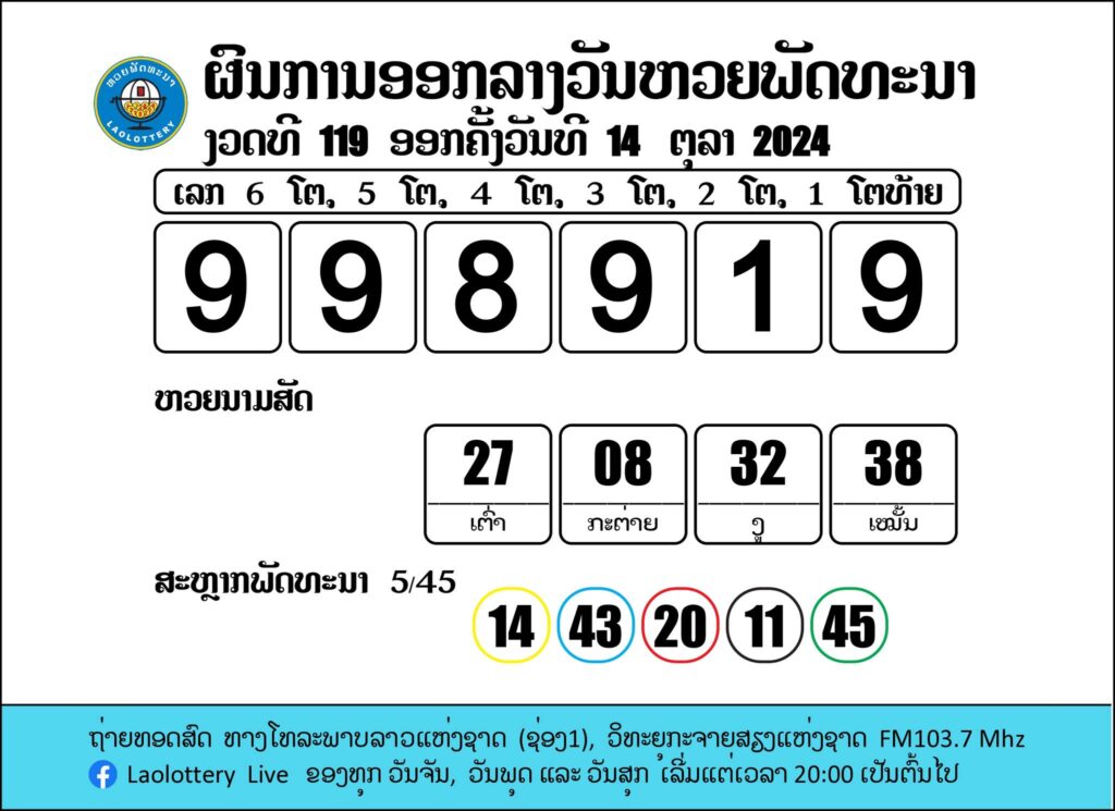 ผลรางวัลหวยลาววันนี้ งวดวันที่ 14 ตุลาคม 2567