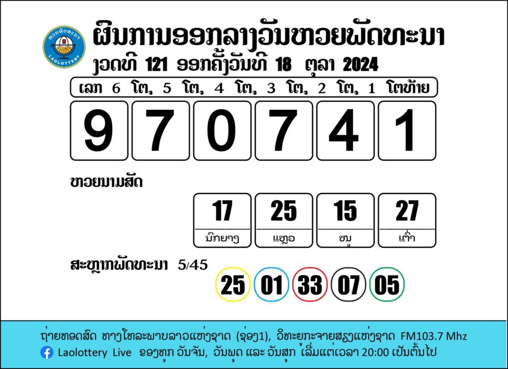 ผลรางวัลหวยลาววันนี้ งวดวันที่ 18 ตุลาคม 2567