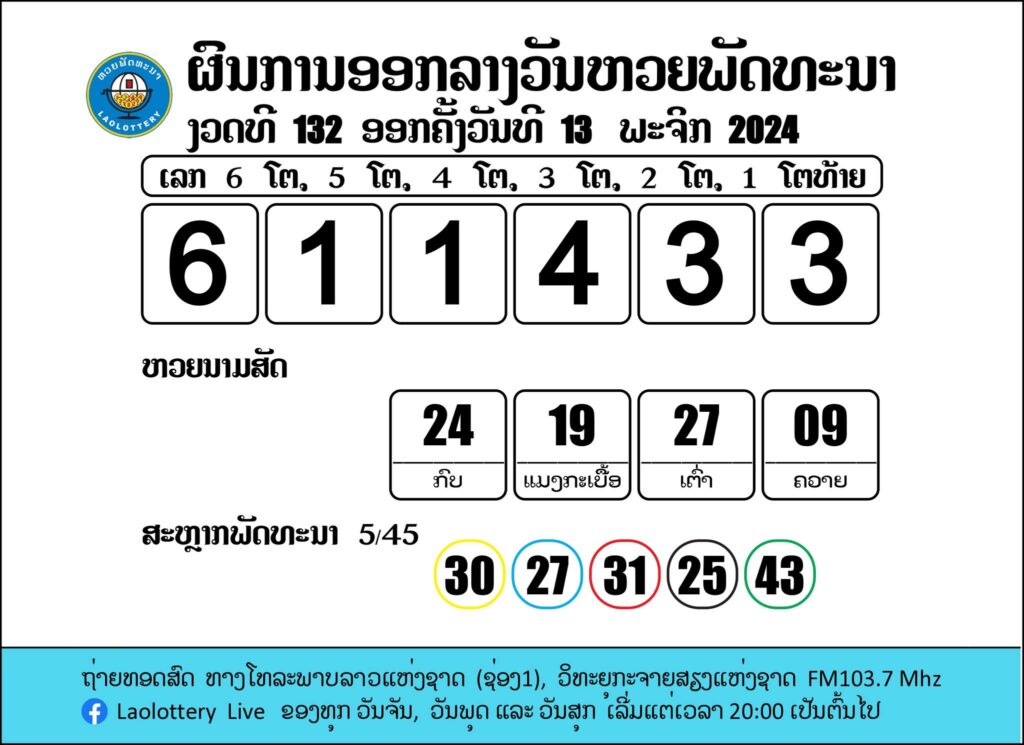 ผลรางวัลหวยลาววันนี้ งวดวันที่ 13 พฤศจิกายน 2567
