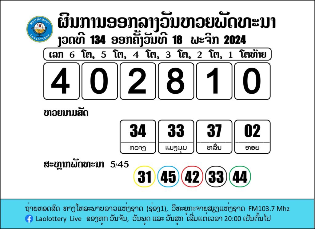 ผลรางวัลหวยลาววันนี้ งวดวันที่ 18 พฤศจิกายน 2567