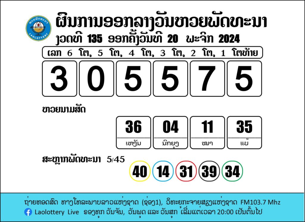 ผลรางวัลหวยลาววันนี้ งวดวันที่ 20 พฤศจิกายน 2567