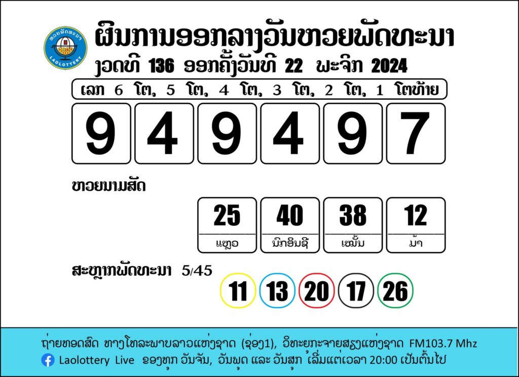 ผลรางวัลหวยลาววันนี้ งวดวันที่ 22 พฤศจิกายน 2567