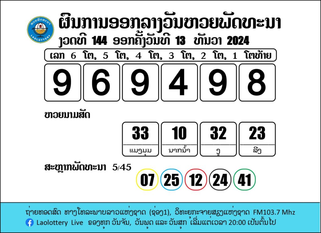 ผลรางวัลหวยลาววันนี้ งวดวันที่ 13 ธันวาคม 2567