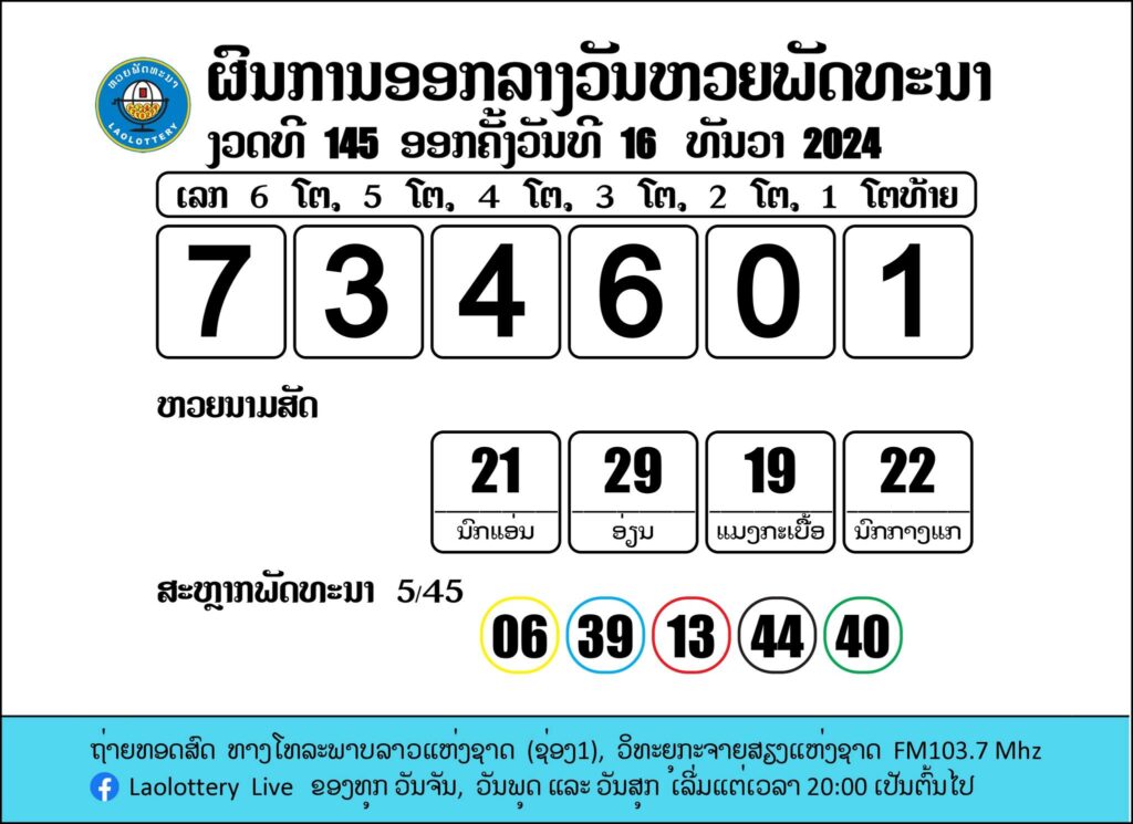 ผลรางวัลหวยลาววันนี้ งวดวันที่ 16 ธันวาคม 2567