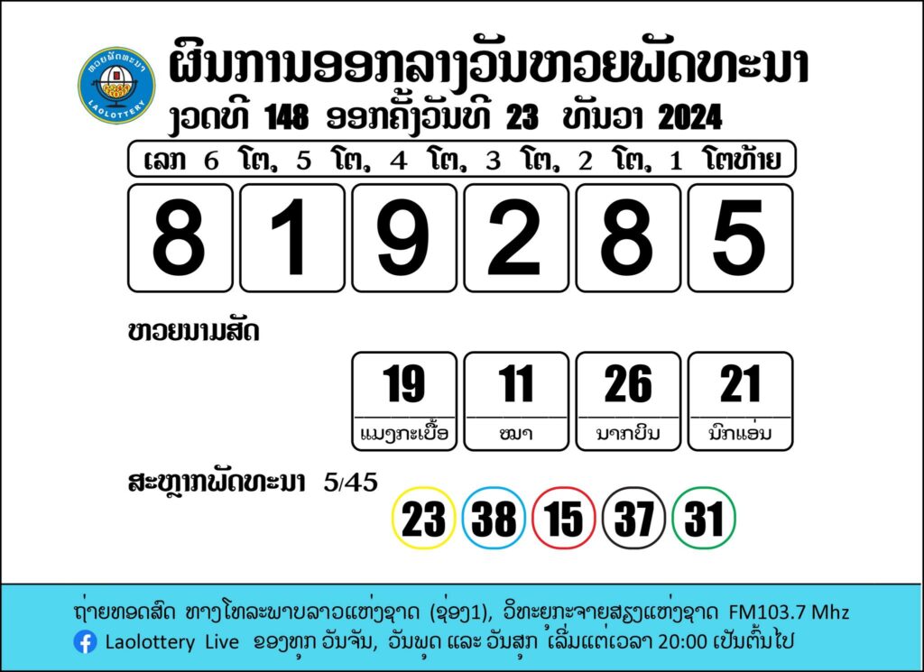 ผลรางวัลหวยลาววันนี้ งวดวันที่ 23 ธันวาคม 2567