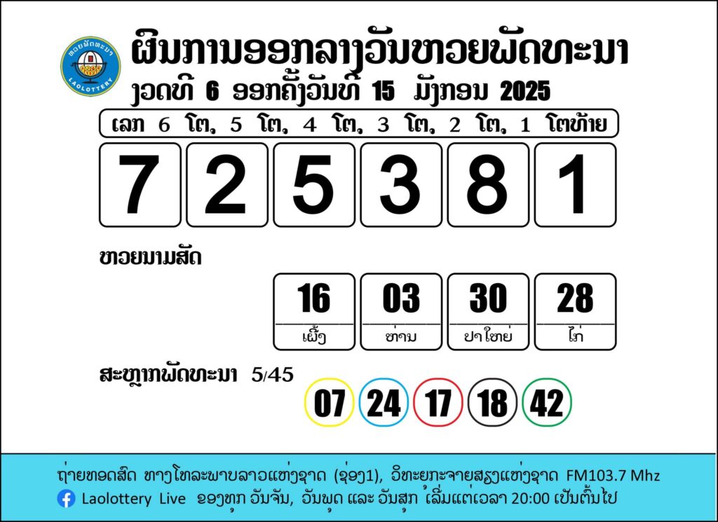ผลรางวัลหวยลาววันนี้ งวดวันที่ 15 มกราคม 2568