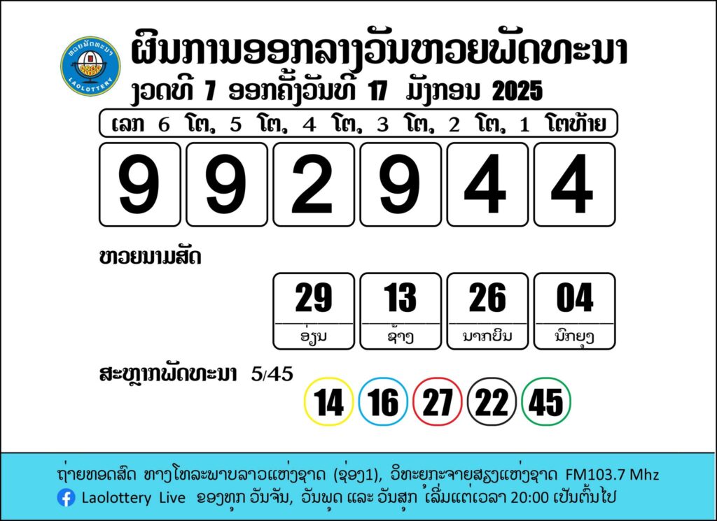 ผลรางวัลหวยลาววันนี้ งวดวันที่ 17 มกราคม 2568