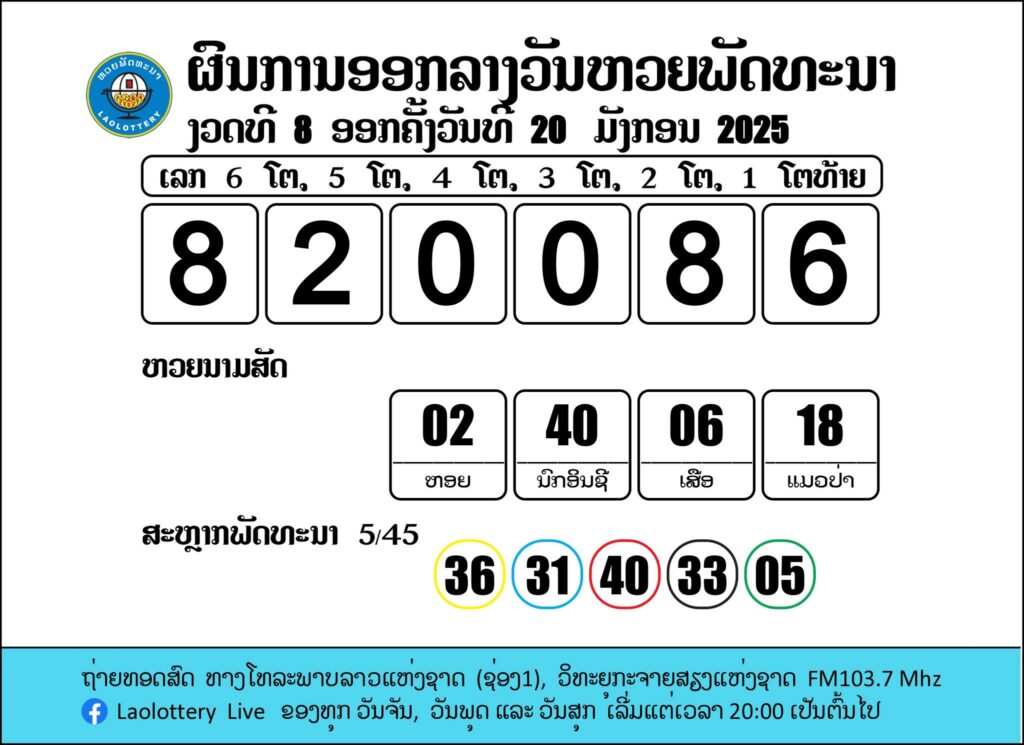 ผลรางวัลหวยลาววันนี้ งวดวันที่ 20 มกราคม 2568