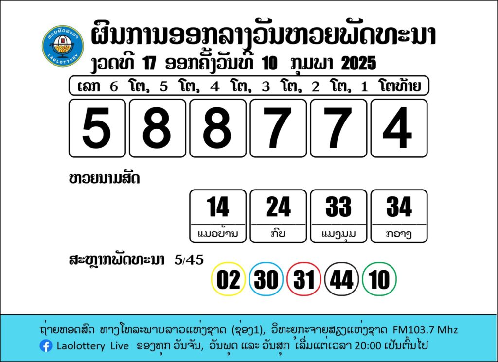 ผลรางวัลหวยลาววันนี้ งวดวันที่ 10 กุมภาพันธ์ 2568