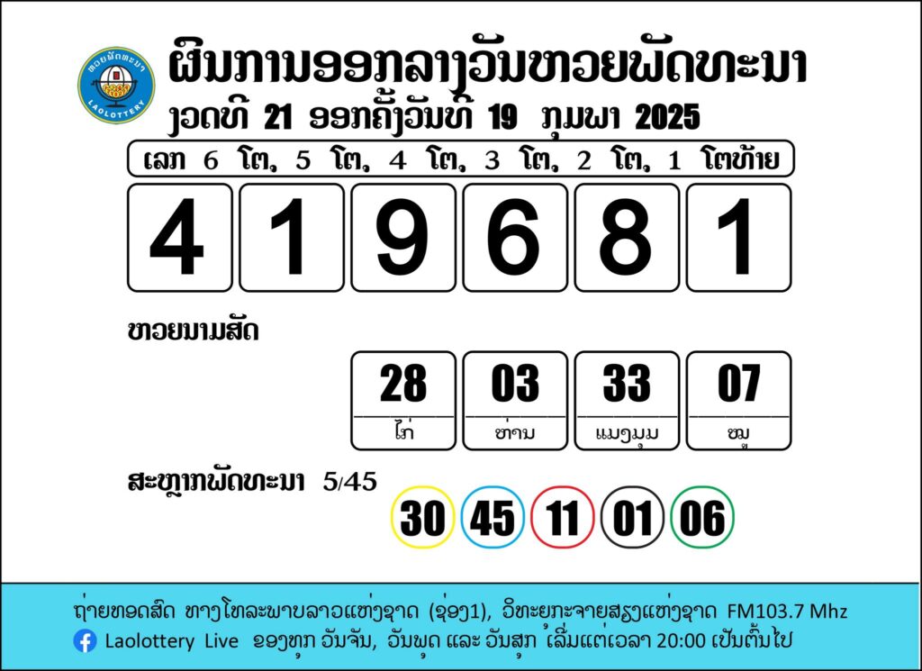 ผลรางวัลหวยลาววันนี้ งวดวันที่ 19 กุมภาพันธ์ 2568