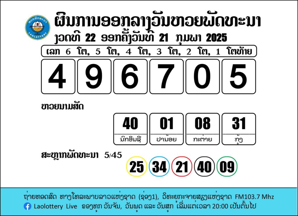 ผลรางวัลหวยลาววันนี้ งวดวันที่ 21 กุมภาพันธ์ 2568