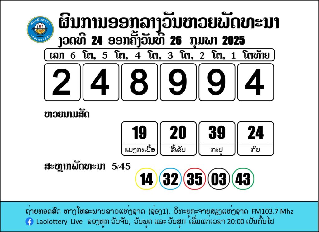 ผลรางวัลหวยลาววันนี้ งวดวันที่ 26 กุมภาพันธ์ 2568