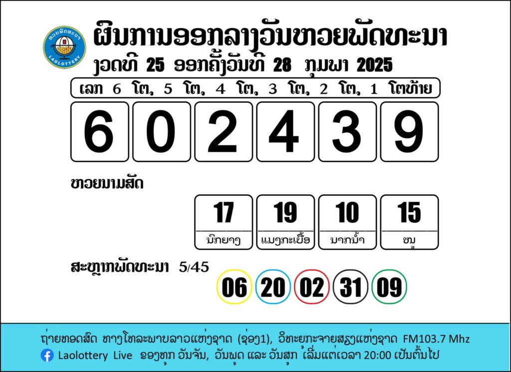 ผลรางวัลหวยลาววันนี้ งวดวันที่ 28 กุมภาพันธ์ 2568
