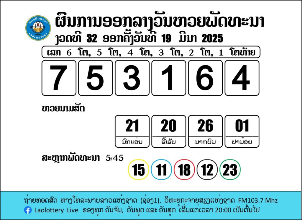 ผลรางวัลหวยลาววันนี้ งวดวันที่ 19 มีนาคม 2568