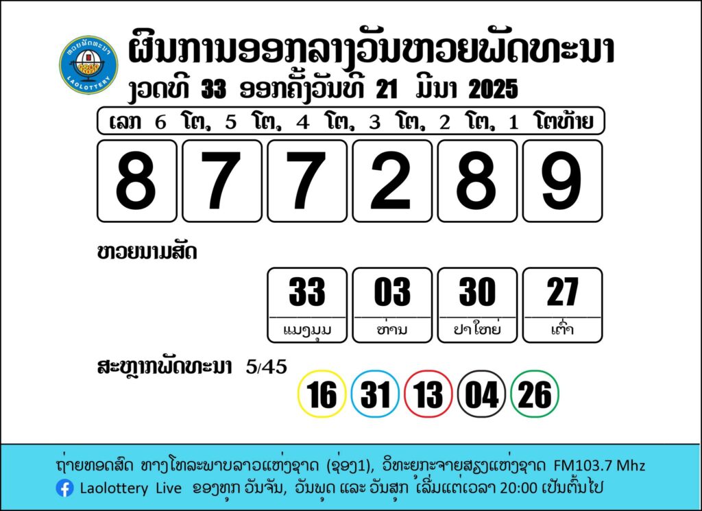 ผลรางวัลหวยลาววันนี้ งวดวันที่ 21 มีนาคม 2568