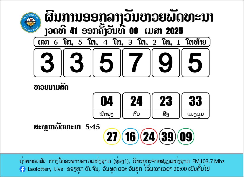 ผลรางวัลหวยลาววันนี้ งวดวันที่ 9 เมษายน 2568