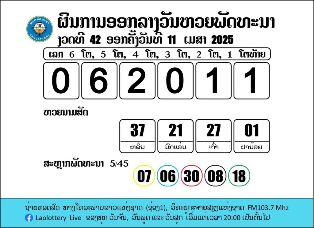 ผลรางวัลหวยลาววันนี้ งวดวันที่ 11 เมษายน 2568