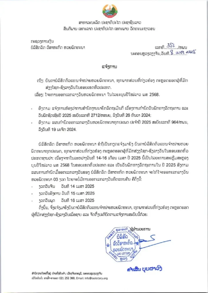 ประกาศจากลาว งดประกาศผลรางวัล หวยลาววันนี้ ตั้งแต่วันที่ 14 ถึง 16 เมษายน 2568 เนื่องจากเป็นวันหยุดราชการช่วง สงกรานต์ โดยจะเริ่มออกรางวัลตามรอบปกติในงวดถัดไปของ หวย 12 ราศี วันที่ 17 เมษายน 2568