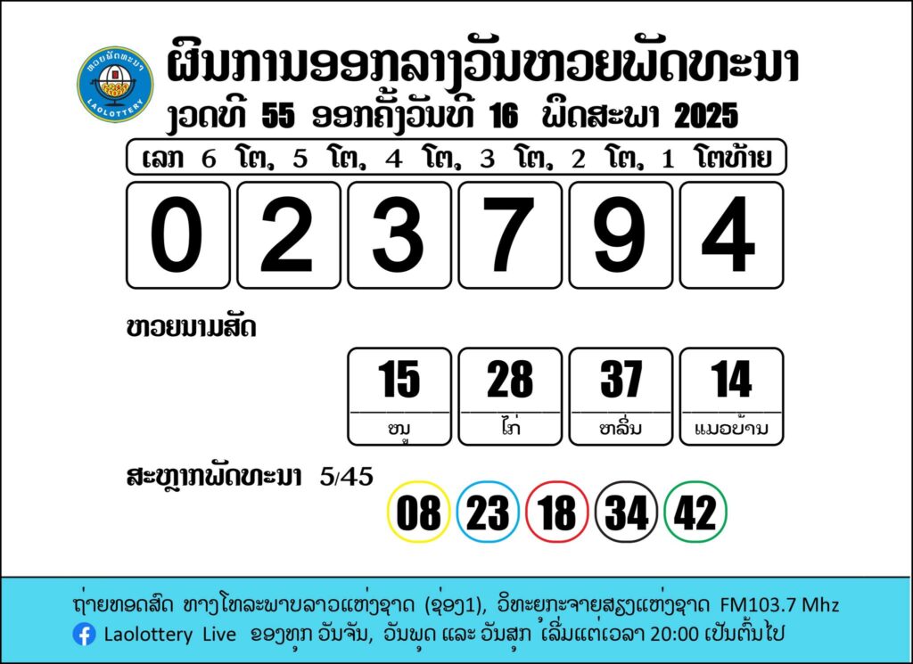 ร่วมตรวจผลหวยลาวงวดล่าสุดวันที่ 16 พฤษภาคม 2568 และอัปเดต ผลหวยลาววันนี้ อย่างรวดเร็วและแม่นยำได้ที่ lotto16th เว็บรายงานผลลาวลดที่ถ่ายทอดสดส่งตรงจากลาว ให้คุณสามารถตรวจผลไปพร้อมกันได้ทุกงวด ตั้งแต่เวลา 20.00 น. เป็นต้นไป โดยหวยลาวพัฒนา (Laolottery) จะออกรางวัลทุกวันจันทร์, วันพุธ, และวันศุกร์ สำหรับผู้ที่พลาดตรวจผลหวยลาวงวดก่อน สามารถ ตรวจหวยลาวย้อนหลัง ได้ที่เว็บไซต์ของเรา ซึ่งเป็นเว็บตรวจหวยลาวออนไลน์ที่มีระบบการรายงานผลที่ทันสมัยที่สุดและรวดเร็วที่สุดในประเทศไทย