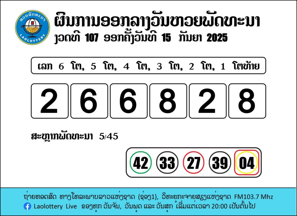 ผลรางวัลหวยลาววันนี้ งวดวันที่ 15 กันยายน 2568