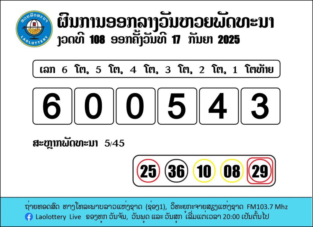 ผลรางวัลหวยลาววันนี้ งวดวันที่ 17 กันยายน 2568