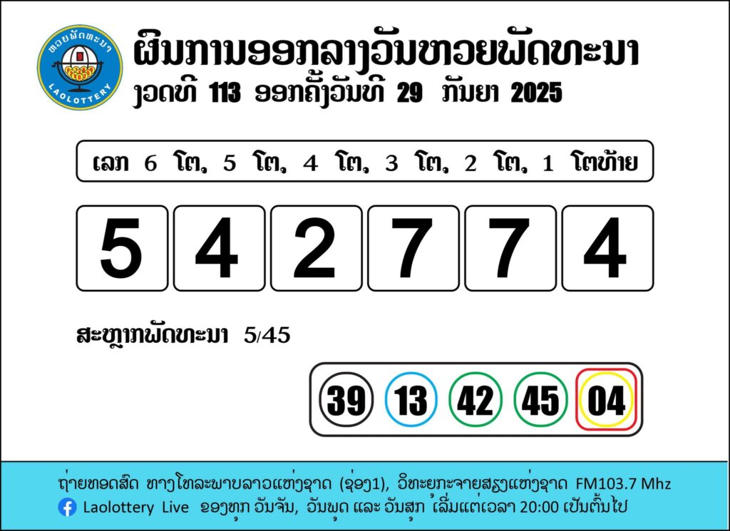 ผลรางวัลหวยลาววันนี้ งวดวันที่ 29 กันยายน 2568