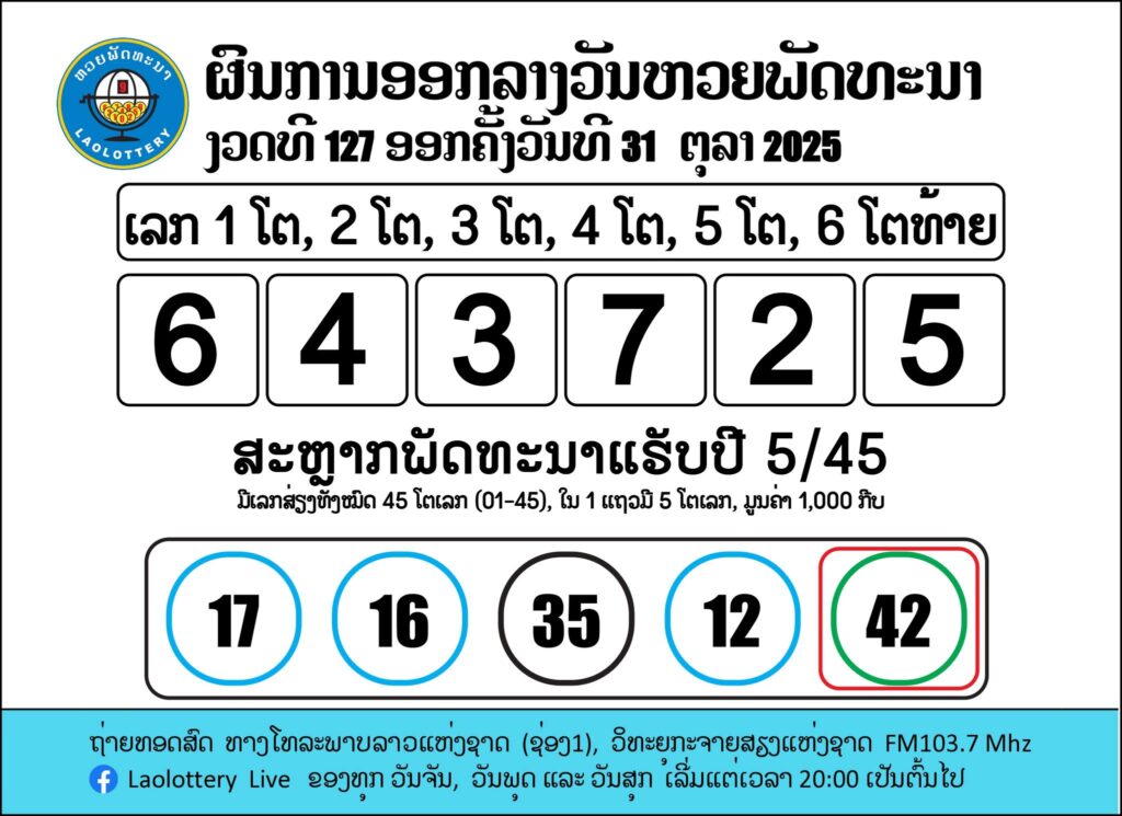 ผลรางวัลหวยลาววันนี้ งวดวันที่ 31 ตุลาคม 2568