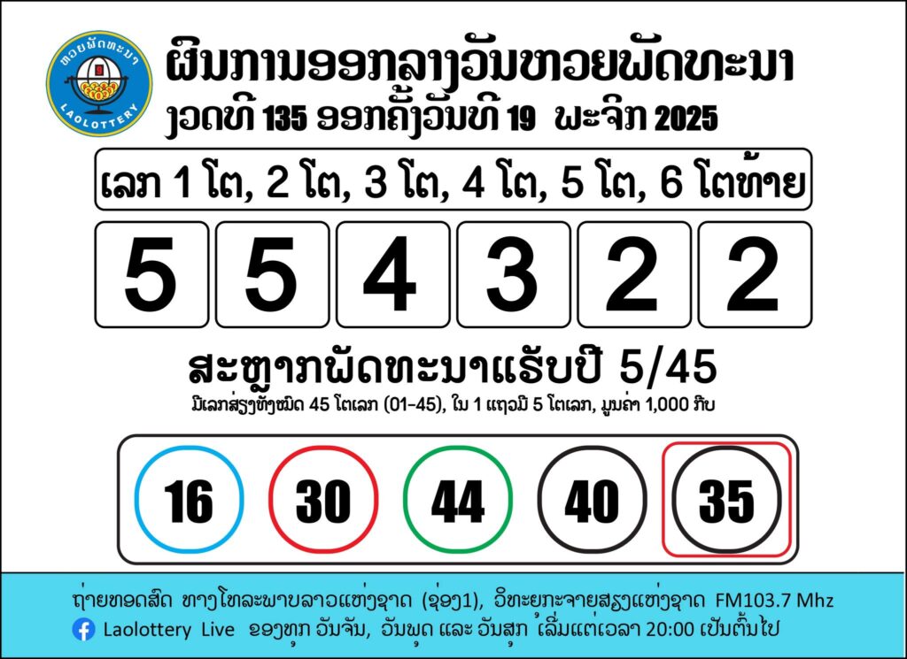 ผลรางวัลหวยลาววันนี้ งวดวันที่ 19 พฤศจิกายน 2568