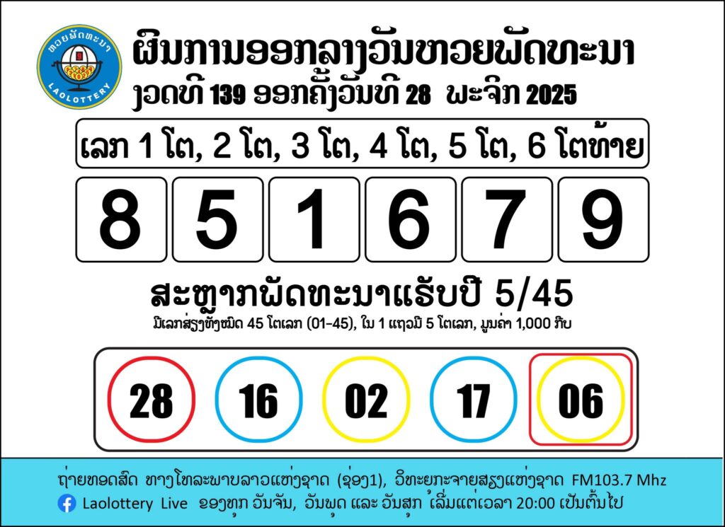 ผลรางวัลหวยลาววันนี้ งวดวันที่ 28 พฤศจิกายน 2568
