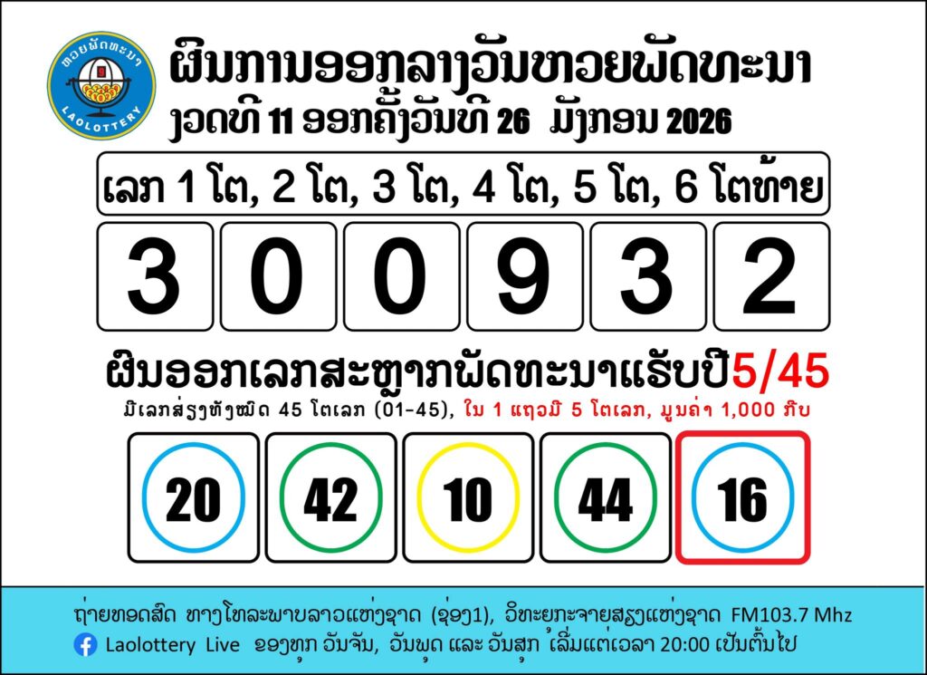 ร่วมตรวจผลหวยลาวงวดล่าสุดวันที่ 26 มกราคม 2569 และอัปเดต ผลหวยลาววันนี้ อย่างรวดเร็วและแม่นยำได้ที่ lotto16th เว็บรายงานผลลาวลดที่ถ่ายทอดสดส่งตรงจากลาว ให้คุณสามารถตรวจผลไปพร้อมกันได้ทุกงวด ตั้งแต่เวลา 20.00 น. เป็นต้นไป โดยหวยลาวพัฒนา (Laolottery) จะออกรางวัลทุกวันจันทร์, วันพุธ, และวันศุกร์ สำหรับผู้ที่พลาดตรวจผลหวยลาวงวดก่อน สามารถ ตรวจหวยลาวย้อนหลัง ได้ที่เว็บไซต์ของเรา ซึ่งเป็นเว็บตรวจหวยลาวออนไลน์ที่มีระบบการรายงานผลที่ทันสมัยที่สุดและรวดเร็วที่สุดในประเทศไทย
