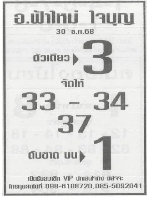 เมื่อพูดถึงสายเลขวิ่งเน้นตัวเดียว หลายคนต้องนึกถึง เลขเด็ด อ.ฟ้าใหม่ ใจบุญ ที่มักปล่อยแนวทางแบบจัดหนัก ชี้เป้าเลขเด่นเพียงเลขเดียวให้คอเลขไปโฟกัสกันชัด ๆ งวดวันที่ 2 มกราคม 2569 ก็เช่นกัน แผ่นแนวทางล่าสุดของอาจารย์ระบุวัน–เดือน–ปีชัดเจน พร้อมวางโครงเลขให้ดูง่ายตามสไตล์เซียนรุ่นเก๋า เหมาะกับคนที่ไม่ชอบตัวเลขเยอะจนตาลาย แต่อยากมองหาจุดโฟกัสหลัก ๆ เอาไว้พิจารณา