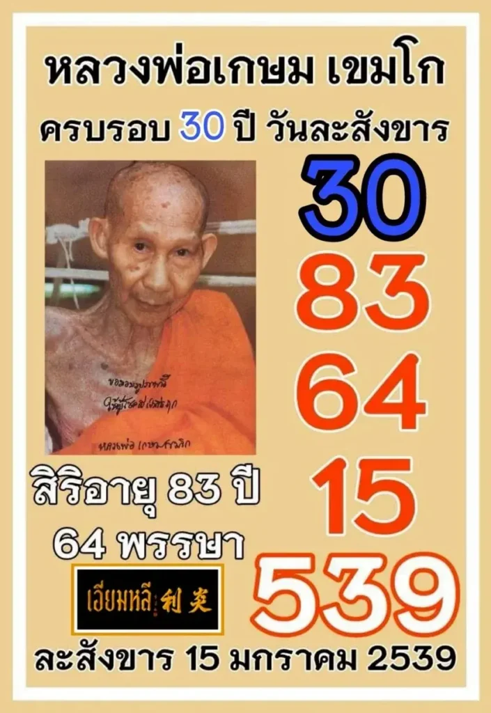 ตัวเลขเหล่านี้คือหัวใจของการตีเป็นแนวทางในครั้งนี้ โดยเฉพาะเลข 30, 83, 64, 15 และ 539 ที่ถูกจัดวางเด่นชัด เหมือนเป็นการ “ชี้เป้า” ให้คอหวยหยิบไปใช้แบบไม่ต้องเดาเยอะ