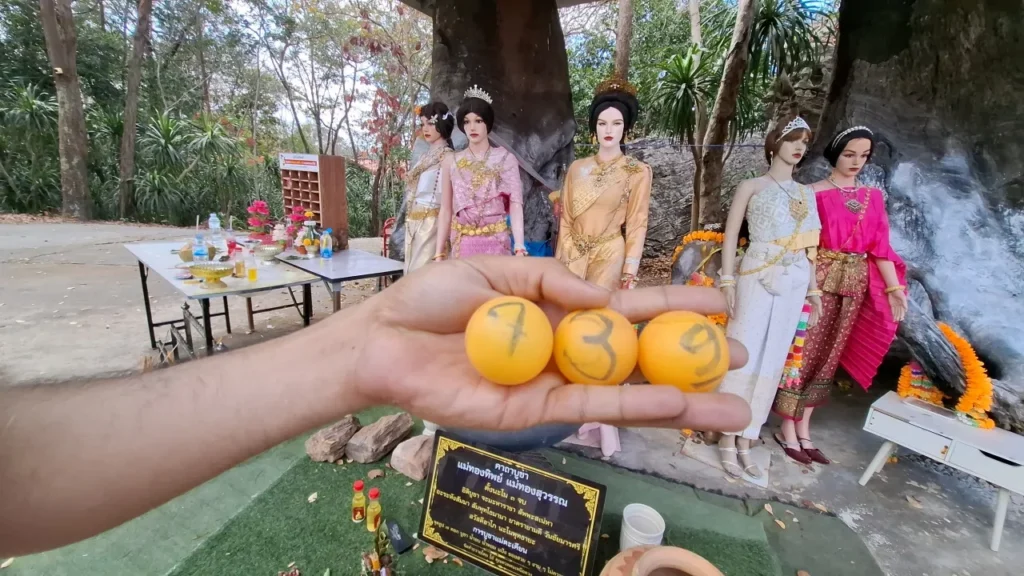 เมื่อไหว้ขอพรครบตามจุดแล้ว นายอนันต์จึงทำพิธีขอแนวทางตัวเลขตามความเชื่อ โดยเริ่มจากการ ธูปเสี่ยงทาย ต่อองค์ปู่มุจลินท์นาคราช ก่อนจะเดินไปที่จุดเจ้าแม่ตะเคียนทอง-ทิพย์เพื่อ “หลับตาล้วงไข่ในไห” ซึ่งเป็นอีกพิธีที่หลายคนเชื่อว่าได้เลขแบบตรงๆ ไม่ต้องตีความซับซ้อน