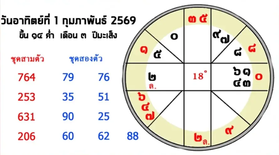 สำหรับหวยงวดที่จะถึงนี้ ออกวันอาทิตย์ที่ 1 กุมภาพันธ์ พ.ศ. 2569 ซึ่งตรงกับวันขึ้น 14 ค่ำ เดือน 3 ปีมะเส็ง เมื่อดูการโคจรของดวงดาวต่างๆ แล้ว สามารถตีเป็นแนวทางเลขเด็ดได้ตามนี้