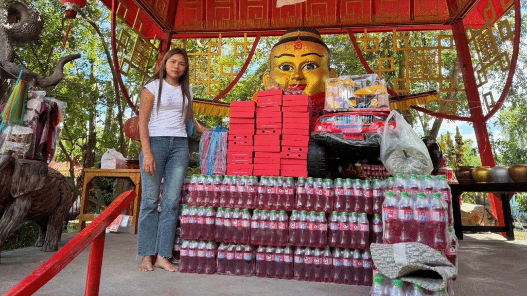 เมื่อมีโอกาสเดินทางมาที่อาศรมเป็นครั้งแรก จึงนำ “พิซซ่า 50 ถาด” และ “น้ำแดง 20 แพ็ค” มาถวายแก้บนตามที่ได้ตั้งจิตอธิษฐานไว้ พร้อมกล่าวขอบคุณกุมารทองเจ้าสัวเฮงที่ช่วยเปิดทางการเงินให้กับตนเอง