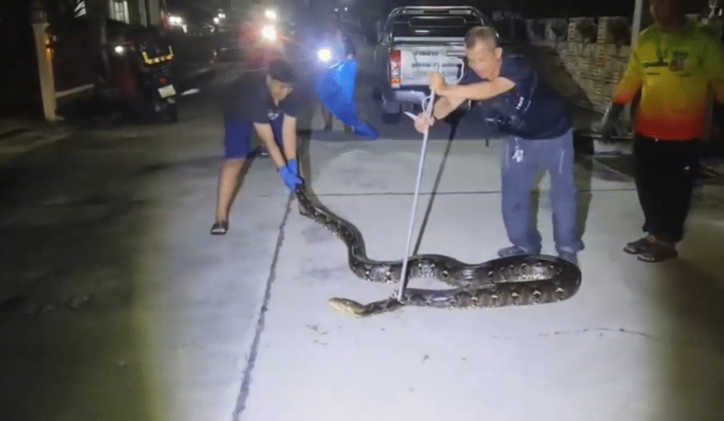 เจ้าหน้าที่กู้ภัย 3 นายรีบเข้ามาที่จุดเกิดเหตุ พบงูเหลือมยักษ์นอนขดนิ่งบนกำแพงเหล็ก ท่าทางสงบนิ่งแต่จ้องตาไม่กระพริบ เจ้าหน้าที่จึงค่อยๆ ใช้บ่วงคล้องคอเพื่อควบคุม แต่พองูรู้ตัวกลับดิ้นสะบัดสุดแรงจนบ่วงหลุด ต้องระดมกำลังช่วยกันจับใหม่อีกครั้ง