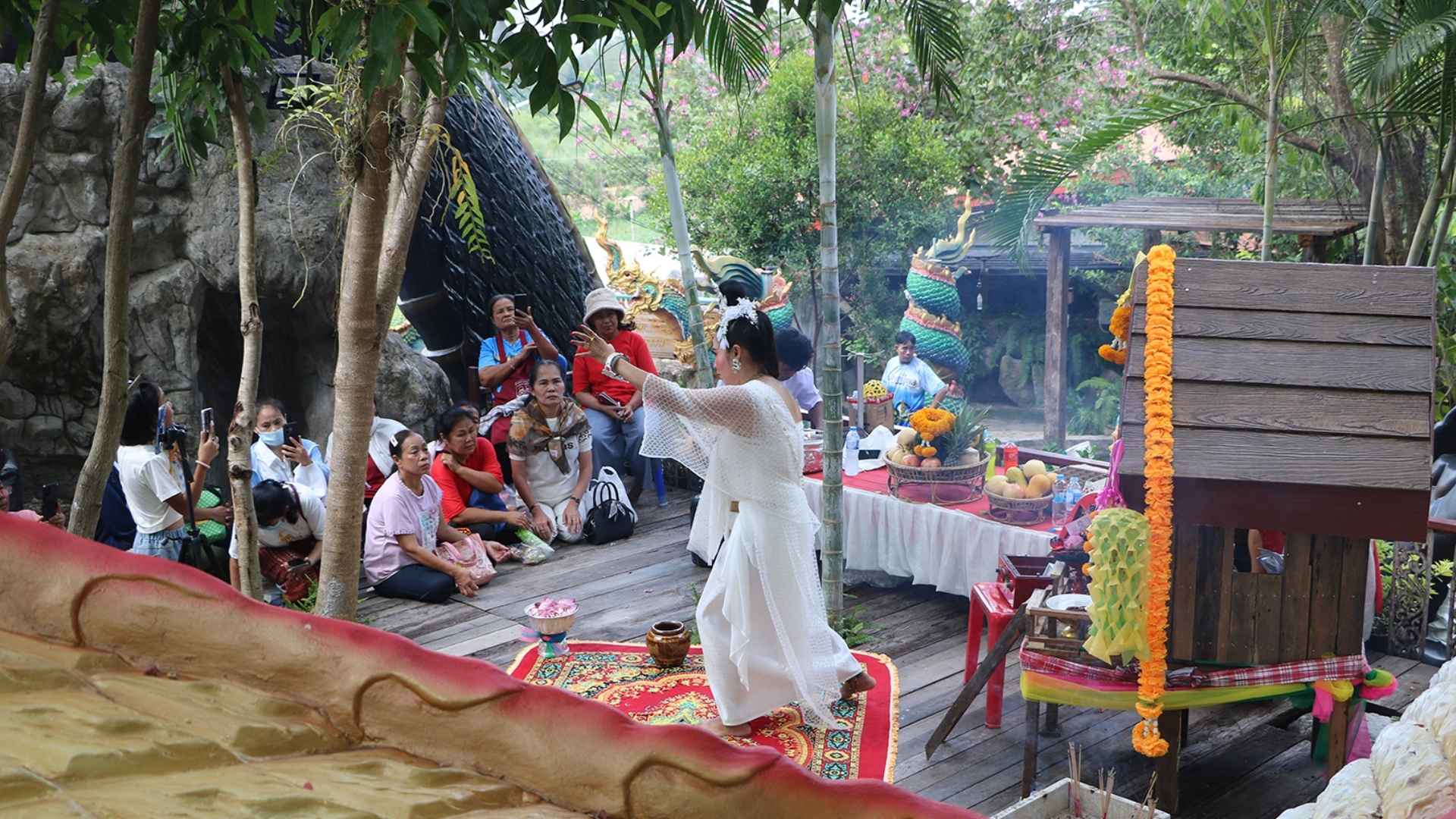 ไฮไลต์ของวันอยู่ที่ “นางสาวสุพชยาฌ์” หรือ “น้องปุ้ย” ชาวกรุงเทพฯ ที่สวมชุดรำสีขาวบริสุทธิ์ เดินทางมาพร้อมเครื่องบูชา เพื่อรำถวายมือแทนการบนบาน หลังจากถูกรางวัลติดต่อกันถึง 4 งวด รับเงินรวมกว่า 500,000 บาท