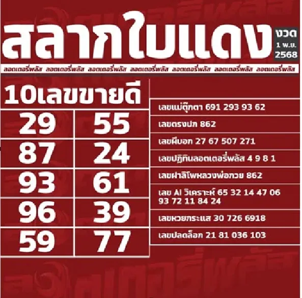 สรุปโพยเด่นจาก สลากใบแดง งวดวันที่ 1 พฤศจิกายน 2568