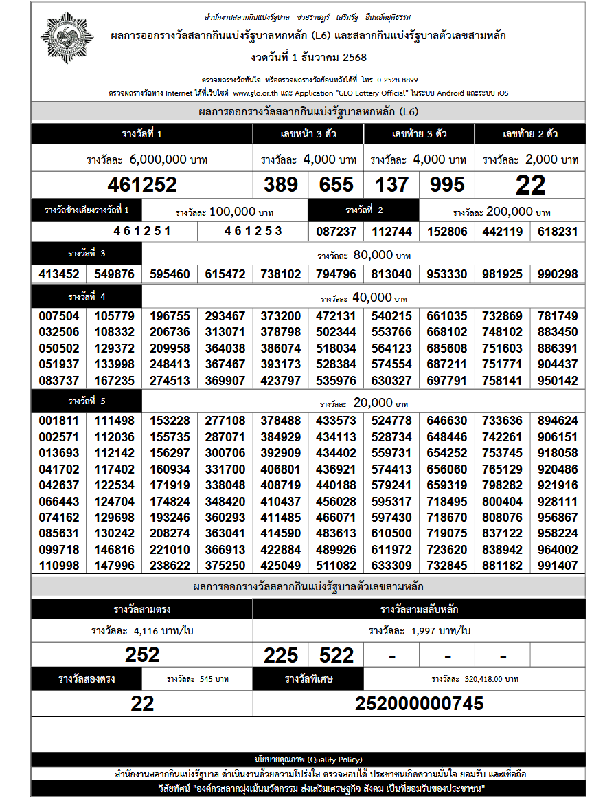 | รางวัลที่ 1 รางวัลละ 6,000,000 บาท | เลขหน้า 3 ตัว 2 รางวัลๆละ 4,000 บาท | เลขท้าย 3 ตัว 2 รางวัลๆละ 4,000 บาท | เลขท้าย 2 ตัว 1 รางวัลๆละ 2,000 บาท |