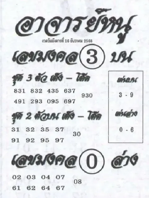 ฝั่ง “ล่าง” อาจารย์หนูจัดเลขมงคลให้เลข 0 เป็นพระเอก พร้อมระบุในช่องกำกับว่า “เด่นล่าง 0–6” บอกทิศทางให้ชัดว่ากลุ่มเลขท้ายล่างน่าจะหมุนในกรอบนี้ ใครที่ชอบเล่นเลขล่างเลยมีฐานตัวเลขให้เอาไปจัดชุดได้ไม่ยาก