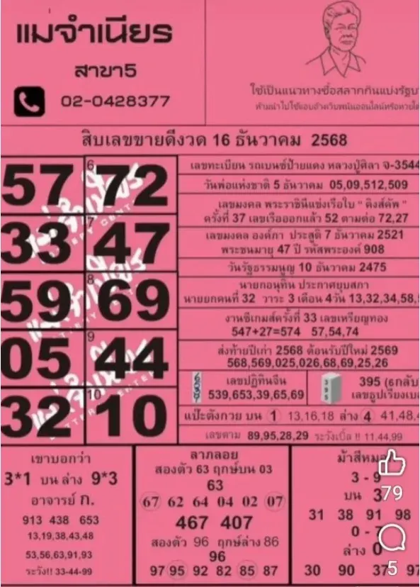 เลขชุดข้างต้นคือสิบเลขที่ลูกค้าหน้าร้านและสายออนไลน์แห่ซื้อกันมากที่สุดในงวดนี้ เหมาะสำหรับคนที่อยากได้ แนวทางหวย แบบกระชับ เลือกเล่นเฉพาะเลขกระแสแรงๆ หรือนำไปผสมกับเลขมงคลส่วนตัวก็ได้